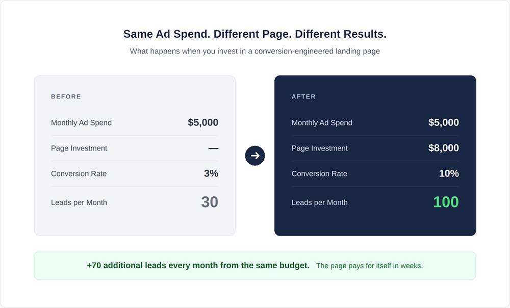 Think about it this way. You spend $5,000 a month on ads. Your page converts at three percent. You get thirty leads. Now imagine investing eight thousand dollars in a properly built page that converts at ten percent. Same ad spend. Same traffic. One hundred leads instead of thirty. That is seventy additional leads every month from the same budget. The page pays for itself in weeks.