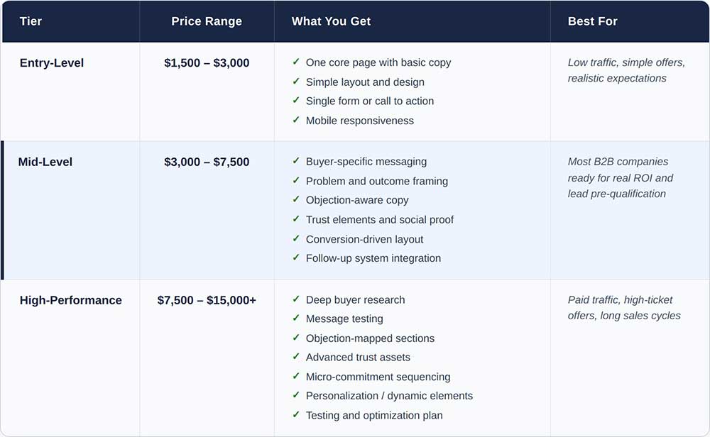 Entry-level landing pages cost between $1,500 and $3,000. This minimum viable version delivers one core page, basic copy, a simple form, and mobile responsiveness, but it usually lacks deep buyer research, objection handling, personalization, and conversion testing.