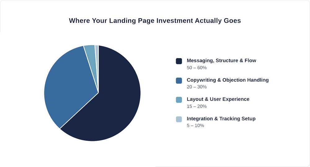 Most value is in thinking and structure—not design. Typically, 50-60% of the cost is for messaging, structure, and flow; 20-30% for copywriting and objection handling; 15-20% for layout and user experience; and 5-10% for integration and tracking.