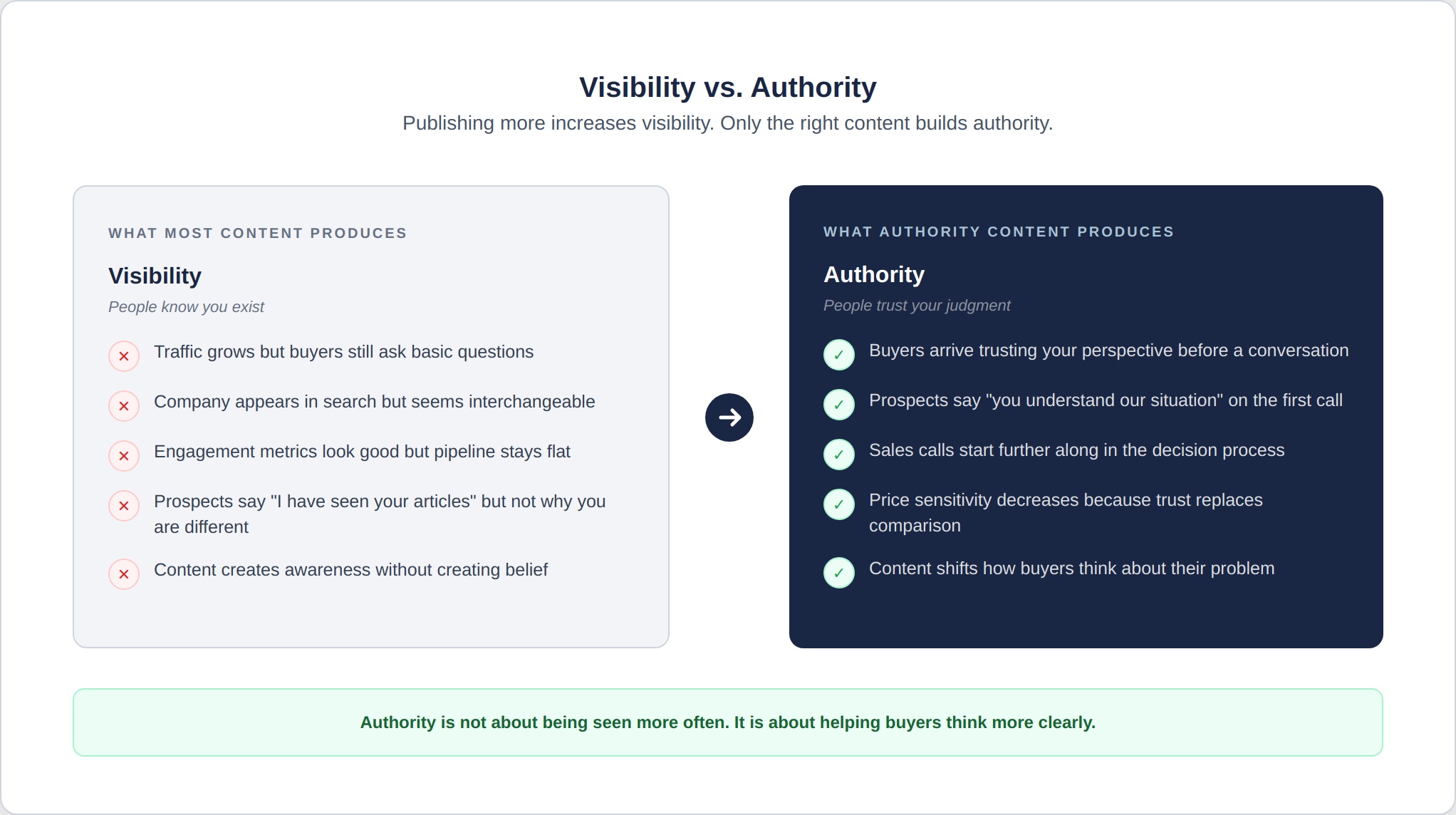 Authority does not come from publishing more content. Authority results from content that helps buyers see their problems differently. When your insights shift a buyer’s perspective, trust is formed. In contrast, content that merely repeats widely available information generates forgettable awareness, which is just visibility, not authority.