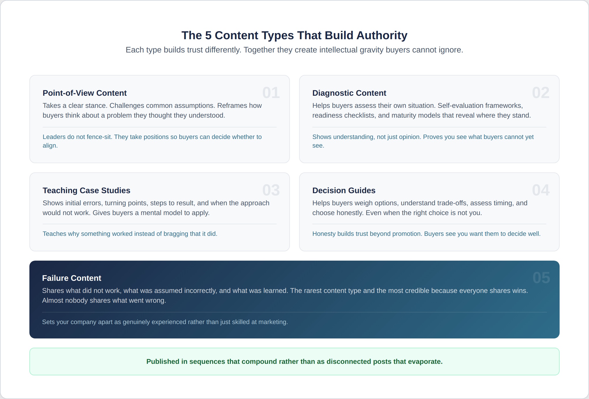 The best content types for building authority focus on learning from judgment calls. Point-of-view content that takes clear positions and explains why things work better that way. Diagnostic content that demonstrates a full understanding of how to move forward. Case studies that show why they were successful, rather than bragging about accomplishing a task. Decision guides that help buyers choose honestly. Failure content that proves real experience. All are published in sequences that compound rather than as disconnected posts that evaporate.