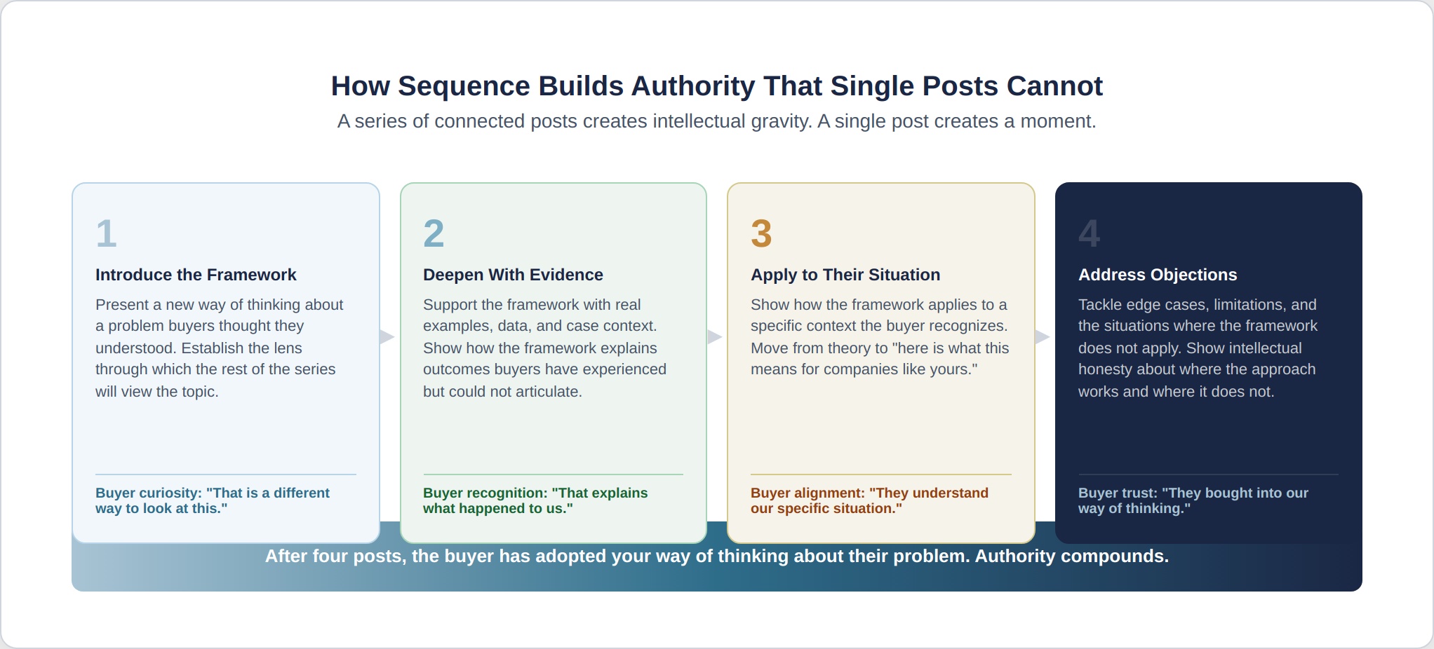 Authority compounds through narrative sequence. A single insightful post creates a moment of credibility. A series of connected posts that build on each other progressively creates intellectual gravity.