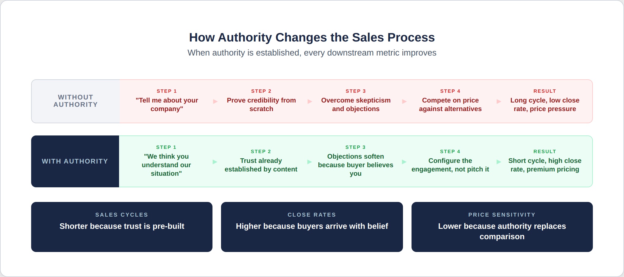 Authority pre-sells confidence. Sales stops being about convincing and becomes about configuring. The buyer already believes you understand the problem. They already trust your approach. They just need to work out the details.