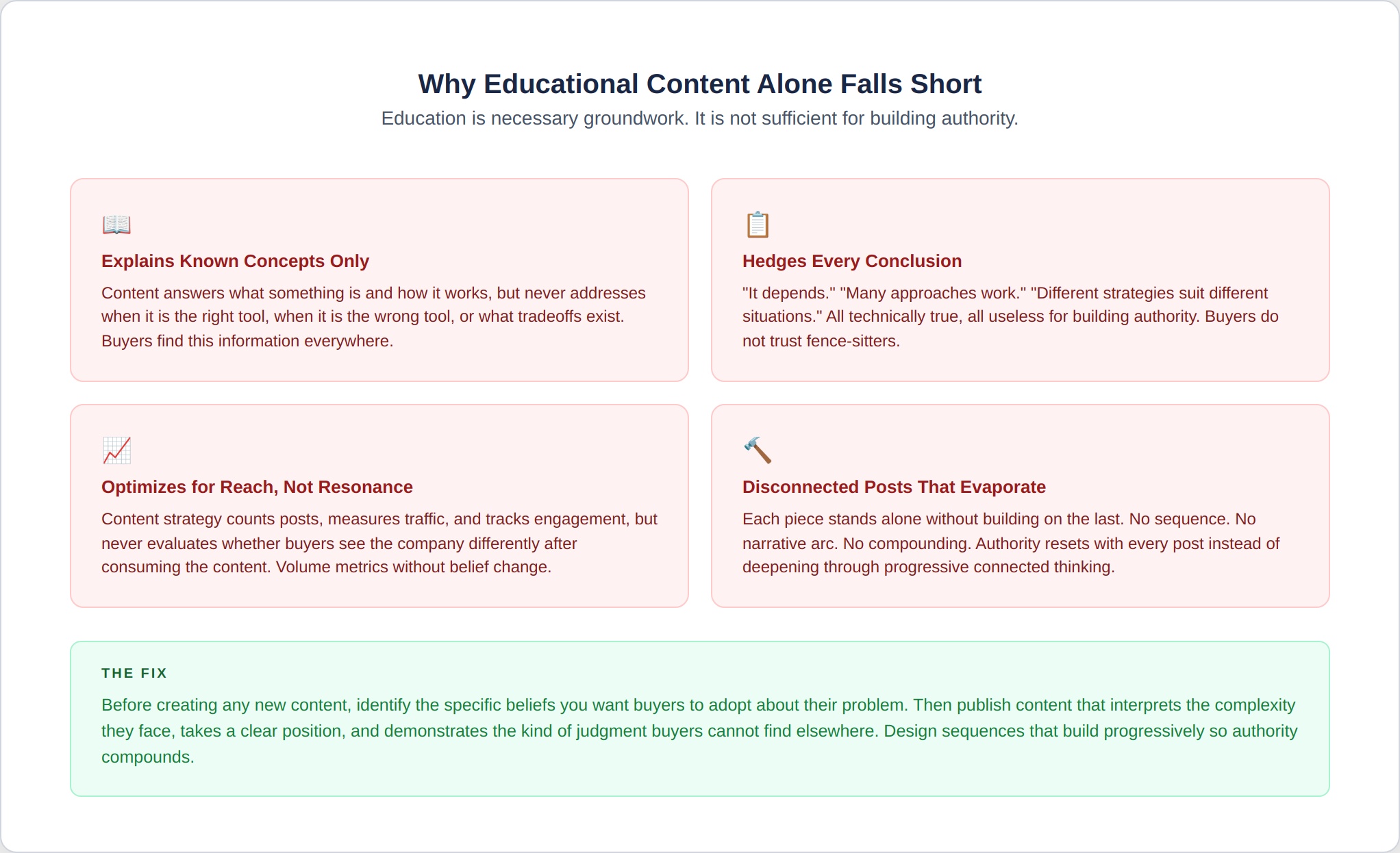 Educational content explains known concepts. Authority content applies those concepts under pressure, with real constraints and consequences. The internet has every educational explanation a buyer needs. It lacks the judgment gained from applying knowledge in complex situations.