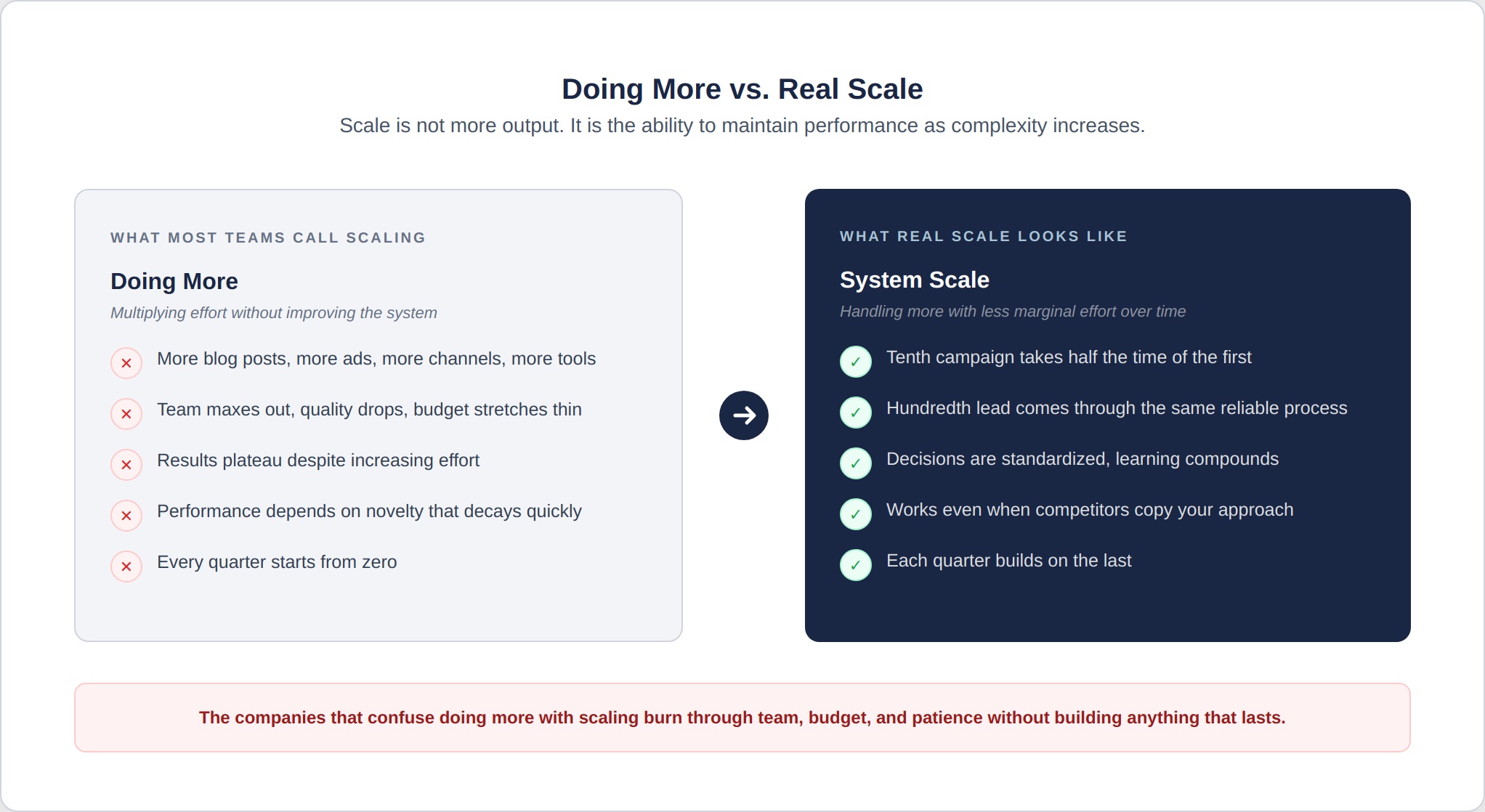 Doing more means increasing output, including more content, more ads, more channels, which eventually hits a wall as the team maxes out and quality drops. Scaling means building a system where each additional unit of effort produces equal or greater results because processes are standardized, learning compounds, and variation is deliberately reduced.