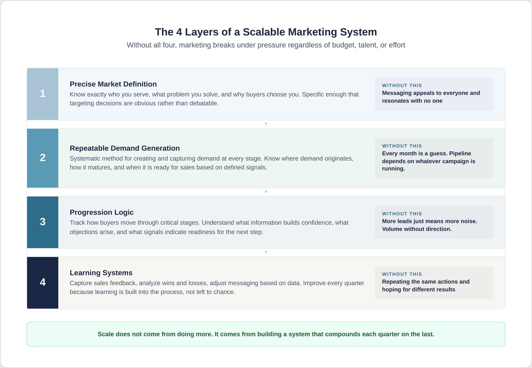 Without all four, marketing breaks under pressure regardless of how much budget, talent, or effort you throw at it. Scale doesn’t come from doing more. It comes from building a system that compounds each quarter on the last rather than starting from zero.