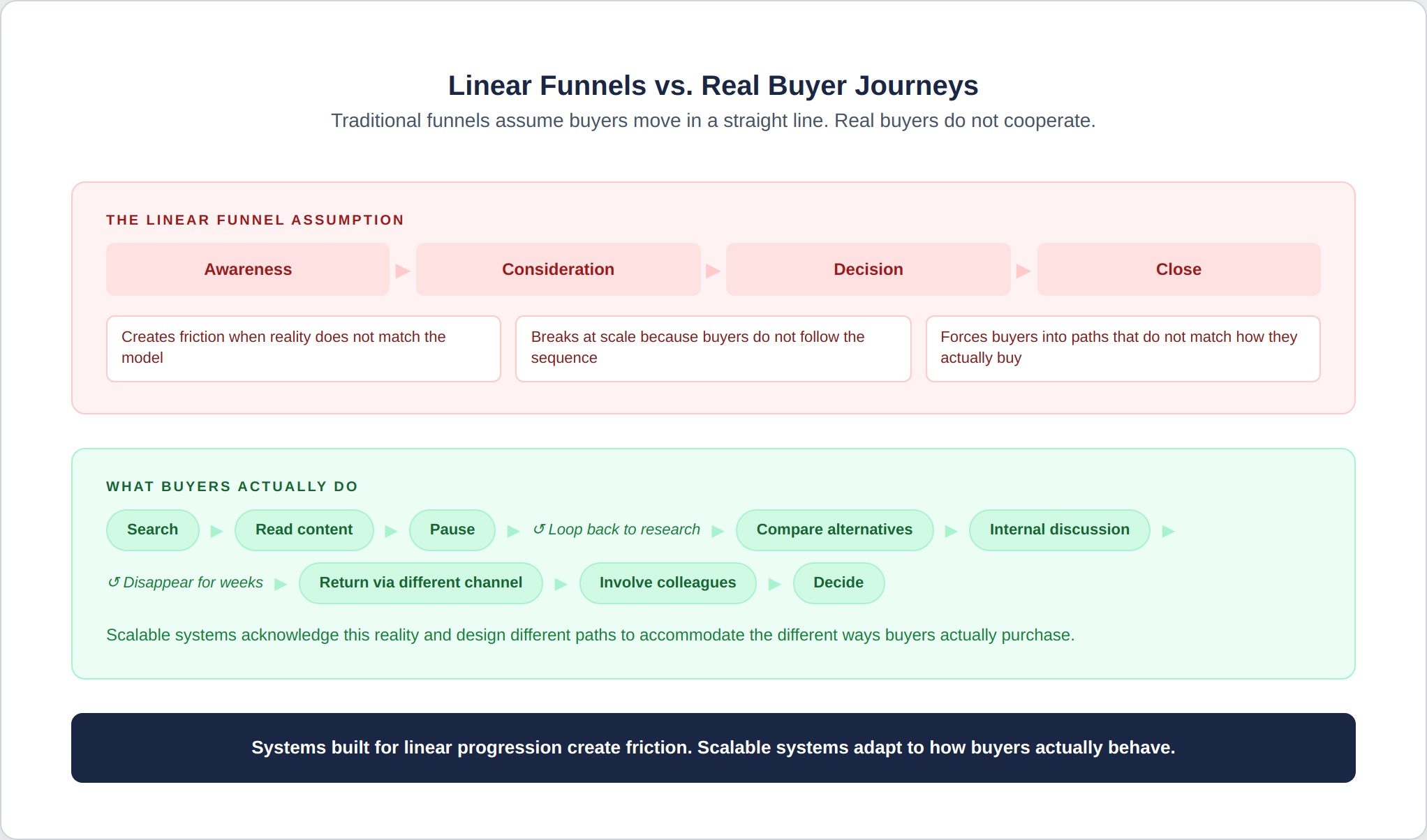 Learning loops mean the system gets smarter. Each quarter is better than the last because accumulated knowledge makes every decision more informed. Without learning loops, you are repeating the same actions, hoping for different results. With all four layers in place, let’s confront a common pitfall: Why do linear funnels break at scale?