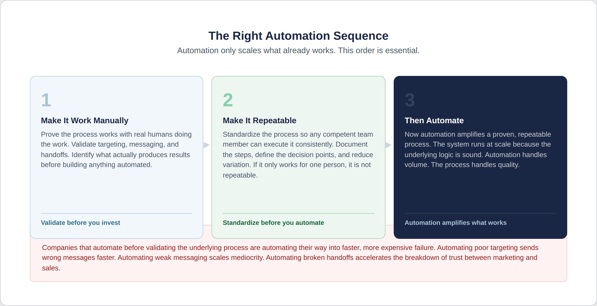 Automation amplifies whatever process it is applied to. If the underlying targeting, messaging, and handoff processes are weak, automation scales those weaknesses faster. Automation only creates scalability when the process has been validated manually first, proven to be repeatable, and confirmed to produce quality results. The sequence is: validate, standardize, then automate.