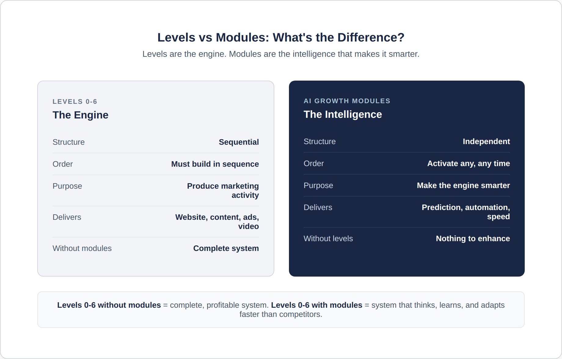 They are not at the same level. Levels 0-6 are sequential. Each one builds on the level below it. AI Growth Modules are different. They are independent enhancements that plug into whichever ecosystem levels are active. You don’t need all of them. You don’t need them in order. You activate the ones that match your goals and your current ecosystem stage.