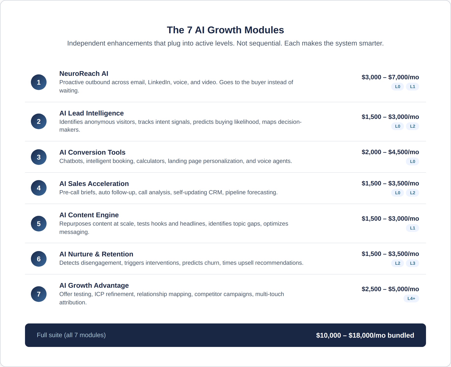 | Module 1: NeuroReach AI | $3,000 – $7,000/mo | Level 0 + Level 1 |