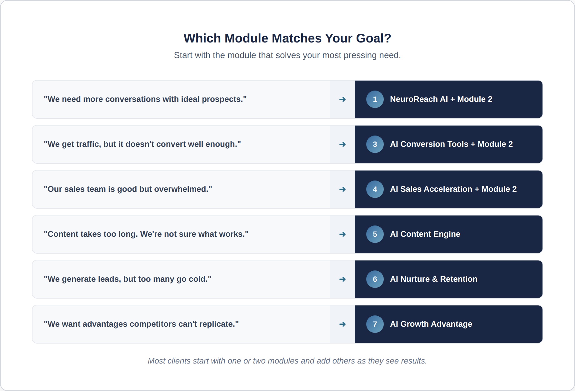 Start with Module 1: NeuroReach AI to reach target companies. Add Module 2: AI Lead Intelligence to spot buying signals.