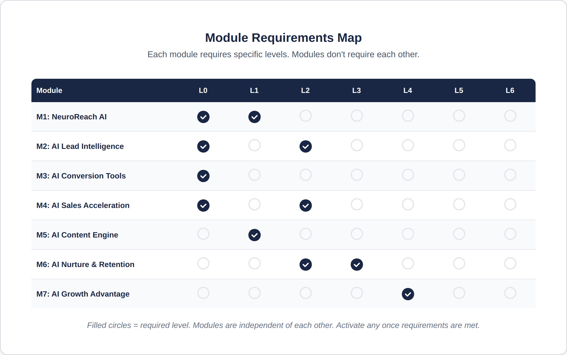 They have requirements, not prerequisites, from each other. Each module requires specific ecosystem levels to be active, as it enhances those levels. Module 3 (AI Conversion Tools) requires Level 0 because it enhances your website. Module 6 (AI Nurture and Retention) requires Levels 2 and 3 because it enhances your automation and email system. But Module 3 doesn’t require Module 6, and Module 6 doesn’t require Module 3. They’re independent.
