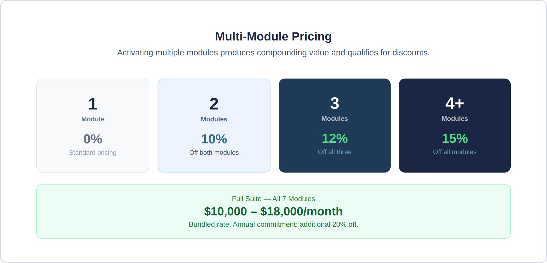 Individual modules are priced separately. Activating multiple modules produces compounding value and qualifies for multiple discounts.