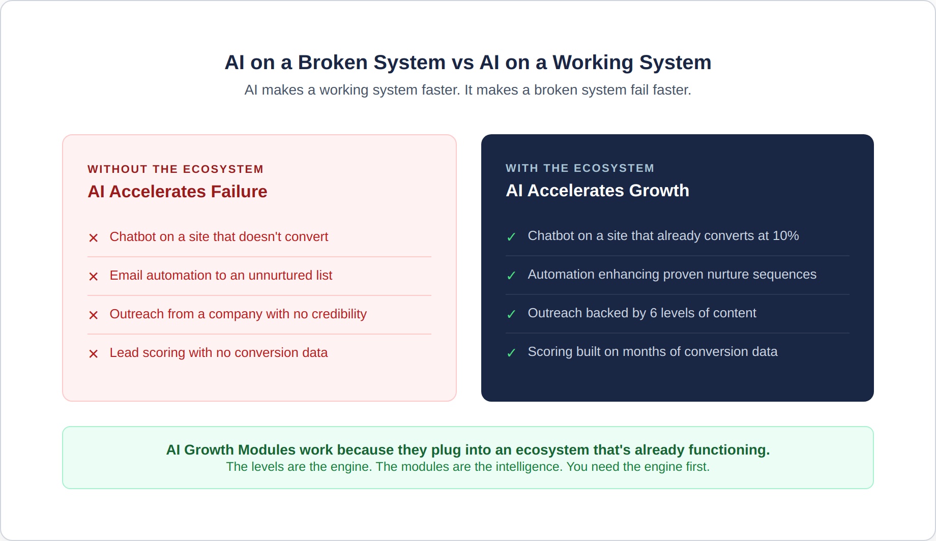 Most agencies selling “AI” are bolting a single tool onto a broken system. They add a chatbot to a website that doesn’t convert. They add email automation to a list that was never nurtured. They add outreach tools to a company with no online credibility. The AI makes the broken system fail faster.