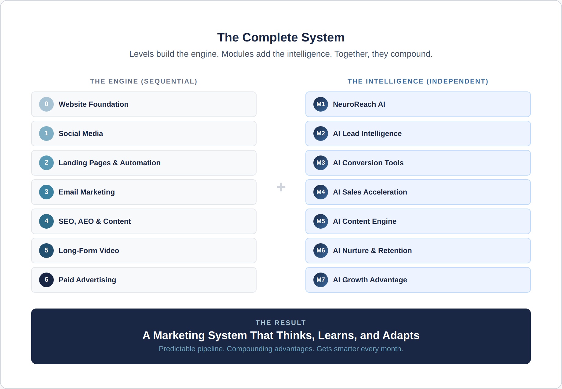 A client running Levels 0-6 with modules has a marketing system that thinks, learns, and adapts faster than any competitor relying solely on manual execution.