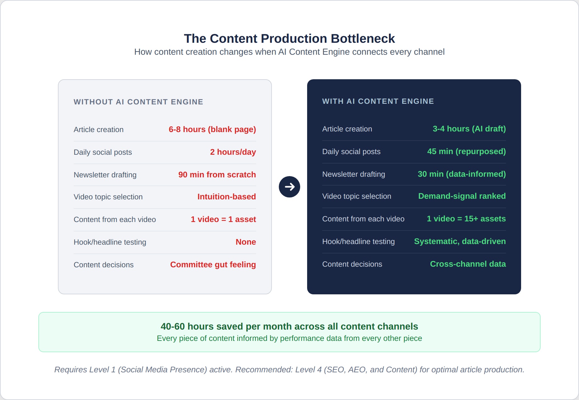 Combined time savings across all content channels typically range from 40 to 60 hours per month for a company running Levels 1, 3, 4, and 5. At the value of that production time, the module pays for itself in efficiency alone.