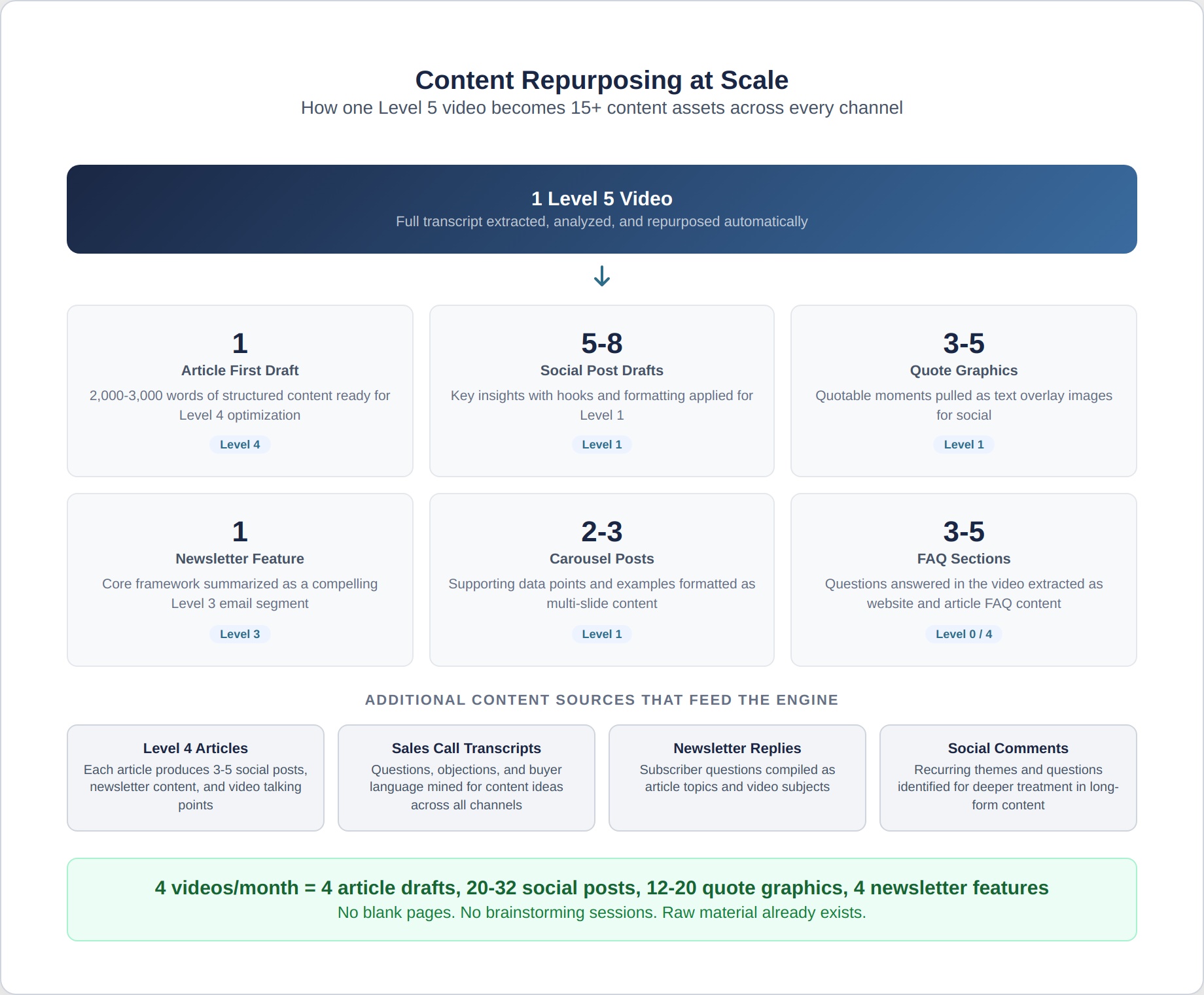 What this means in practice: A company running Levels 1, 3, 4, and 5 with the AI Content Engine active might produce 4 videos per month at Level 5. Those 4 videos, through AI repurposing, produce 4 article first drafts, 20-32 social post drafts, 12-20 quote graphics, 4 newsletter features, and raw material for the next month’s content calendar. The Level 4 writer isn’t staring at a blank page. The Level 1 content manager isn’t brainstorming topics. The Level 3 newsletter writer isn’t wondering what to cover. The raw material is already there.