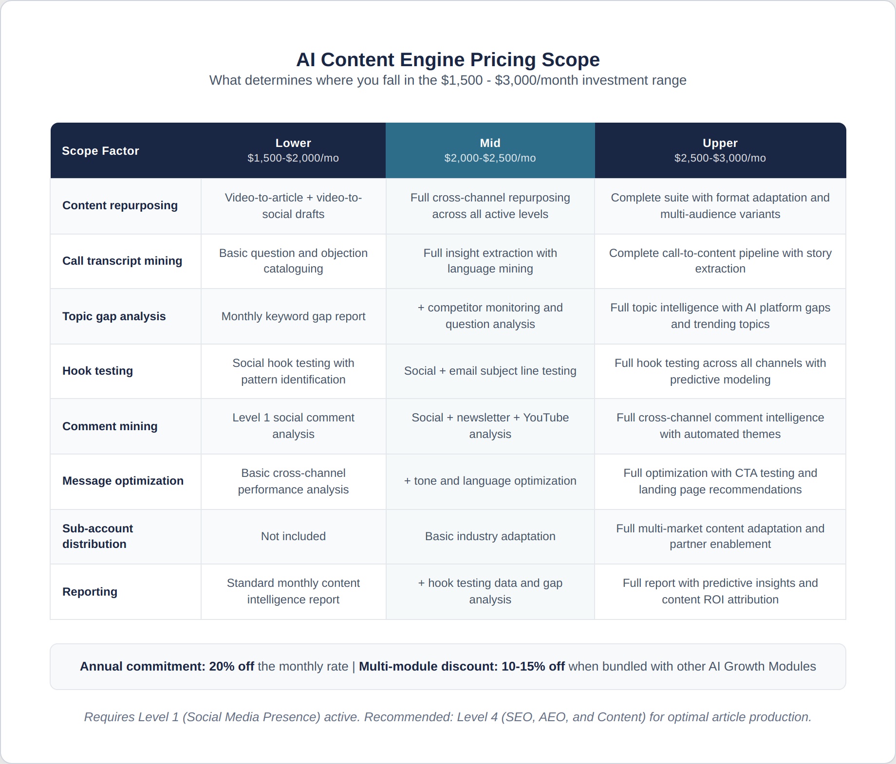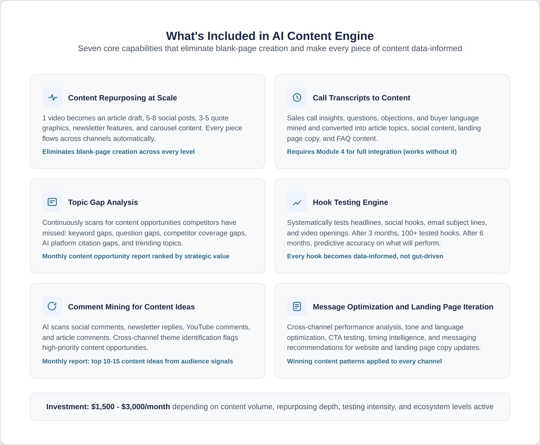 - The investment ranges from $1,500 to $3,000/month, depending on content volume, repurposing depth, testing intensity, and the number of ecosystem levels the engine feeds