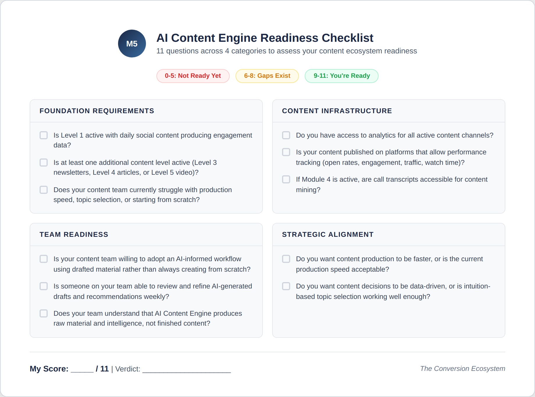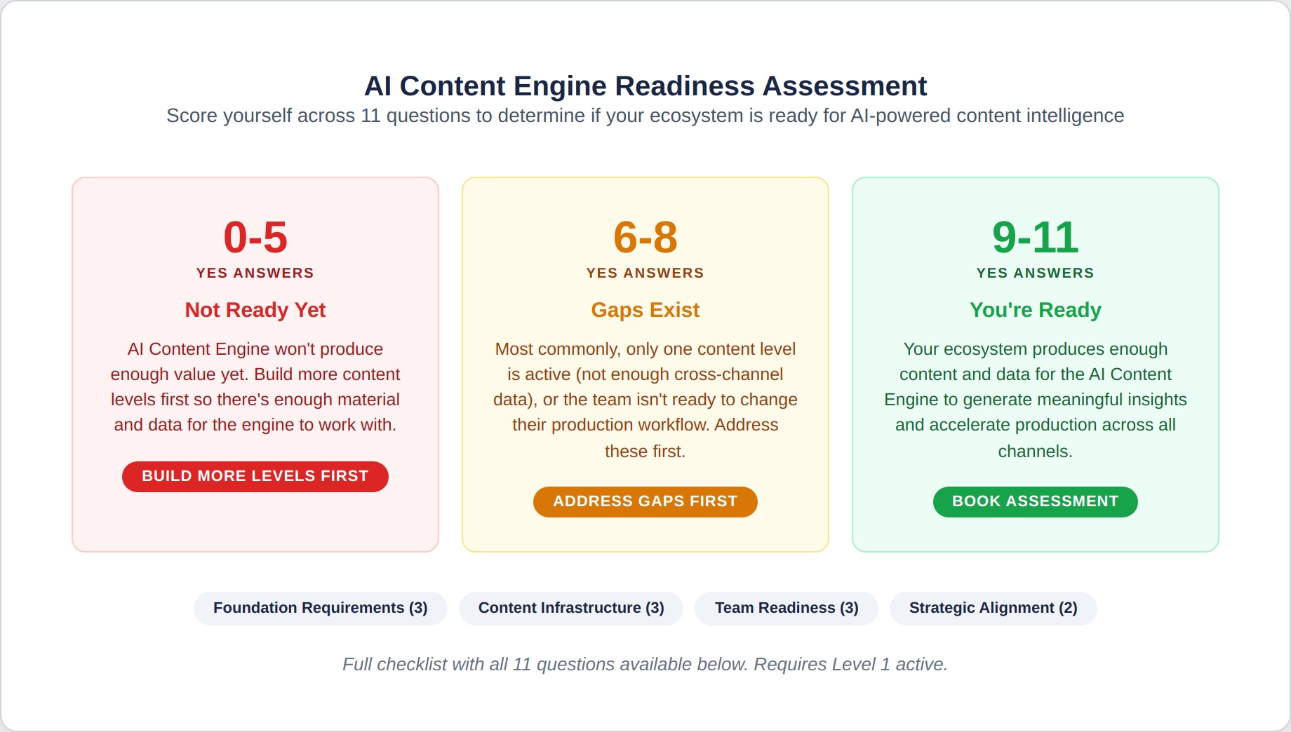 5 or fewer YES answers: AI Content Engine won’t produce enough value yet. Build more content levels first so there’s enough material and data for the engine to work with.