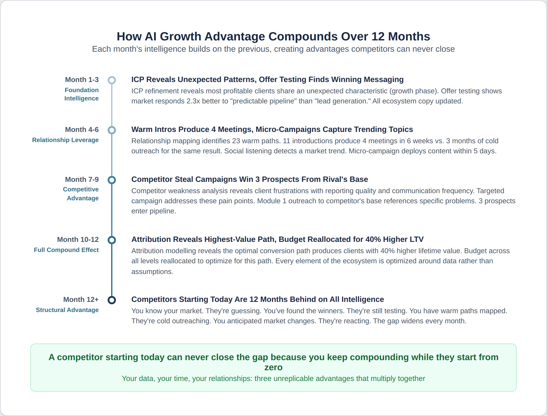 Months 7-12: Full compound effect. ICP is data-defined rather than assumption-defined. Offer positioning is optimized through 6+ rounds of testing. Relationship intelligence has produced multiple warm introductions that converted. Attribution modelling confidently shows which investment combinations produce the highest ROI. Every strategic decision across the ecosystem is informed by accumulated intelligence.