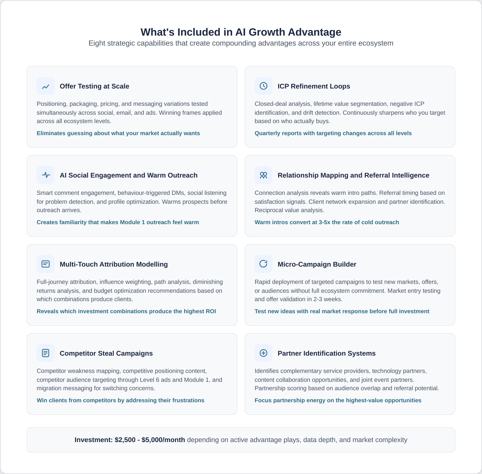What’s included: Offer testing (positioning, packaging, pricing), ICP refinement loops with lifetime value analysis and negative ICP identification, AI social engagement intelligence (comment engagement, smart DMs, social listening, profile optimization), warm outreach triggers, relationship mapping with warm introduction paths, referral timing and prompt system, partner identification, multi-touch attribution modeling with path analysis, micro-campaign building and deployment, competitor steal campaign development, monthly strategy reporting, and quarterly deep strategy sessions.