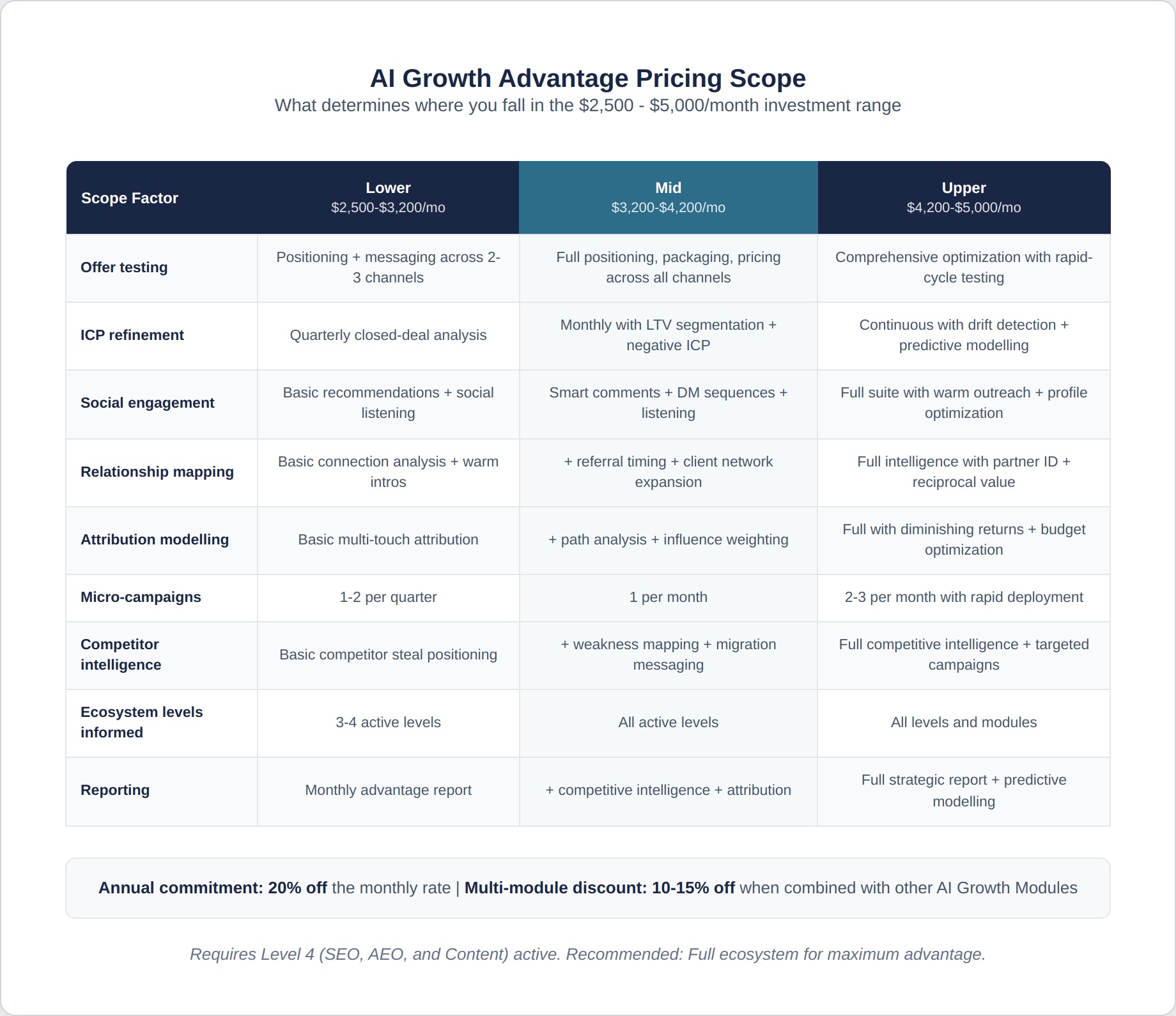 | AI Growth Advantage monthly | $2,500 – $5,000/month |