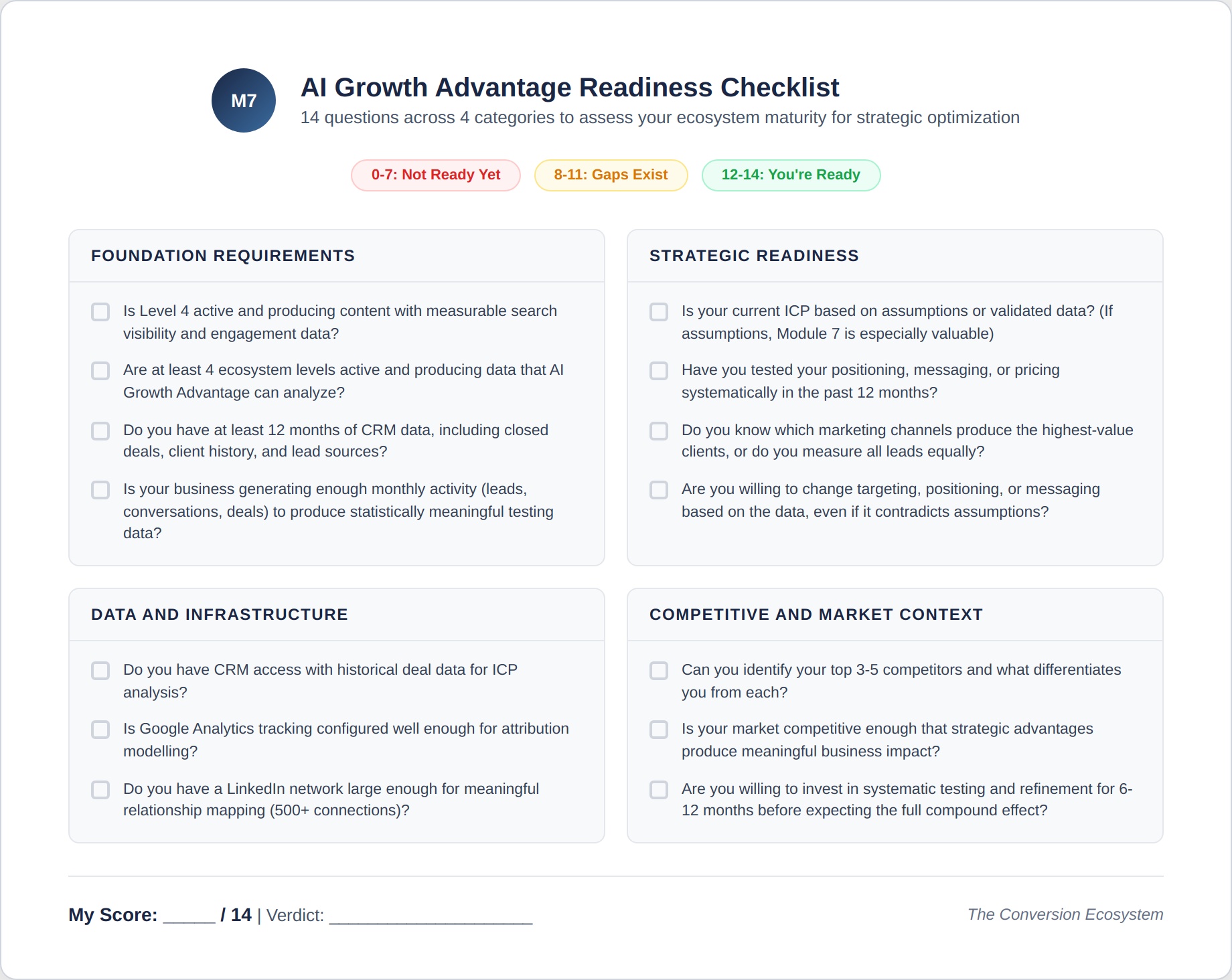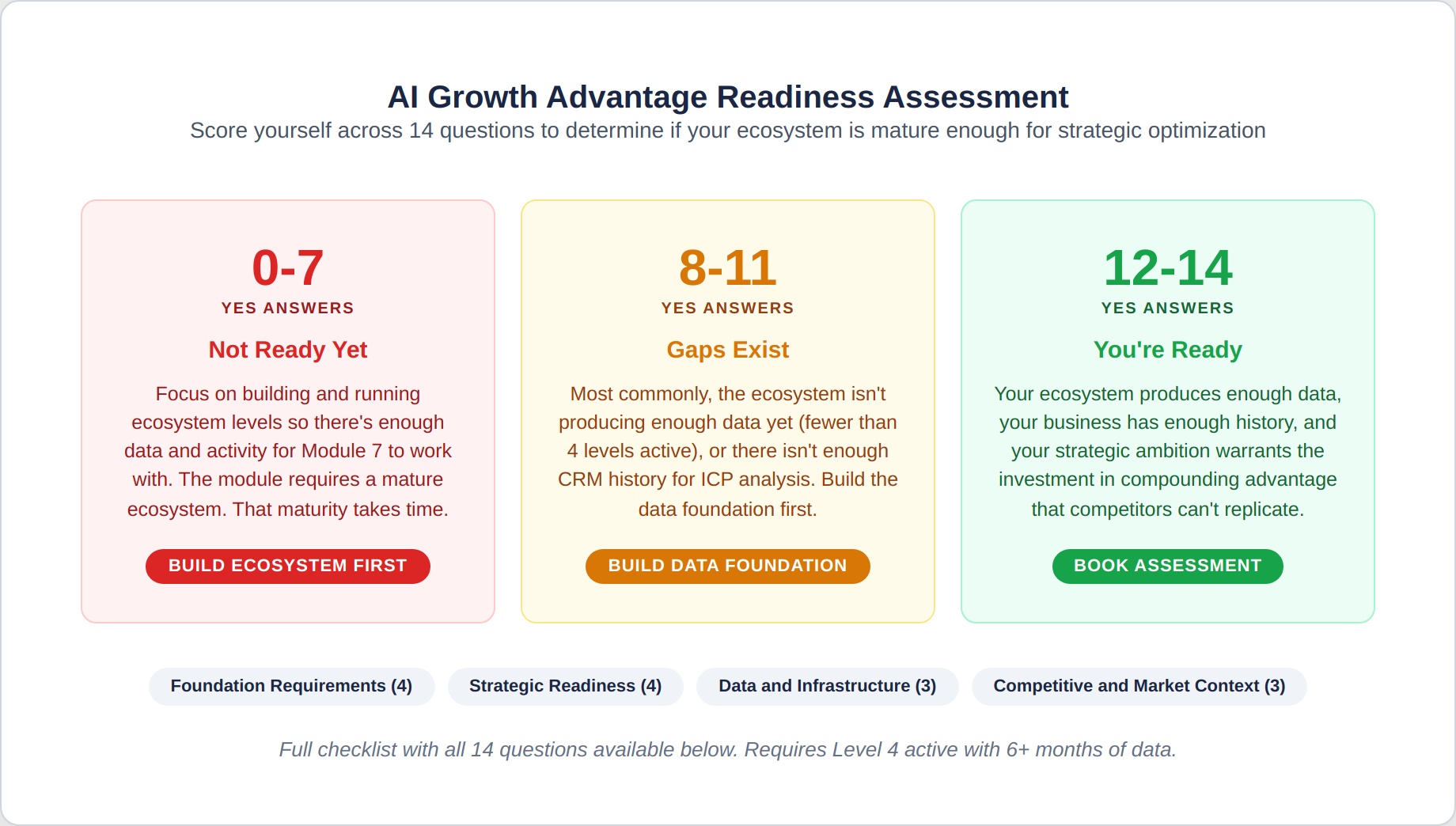7 or fewer YES answers: AI Growth Advantage won’t produce enough value yet. Focus on building and running the ecosystem levels so there’s enough data and activity for Module 7 to work with. The module requires a mature ecosystem. That maturity takes time.