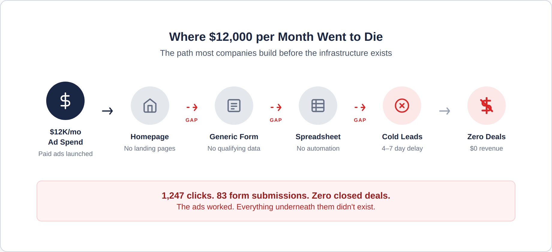 The diagnosis: “We spent twelve thousand dollars driving traffic into a system that has no infrastructure to convert it. The ads worked. Everything underneath them didn’t exist.”