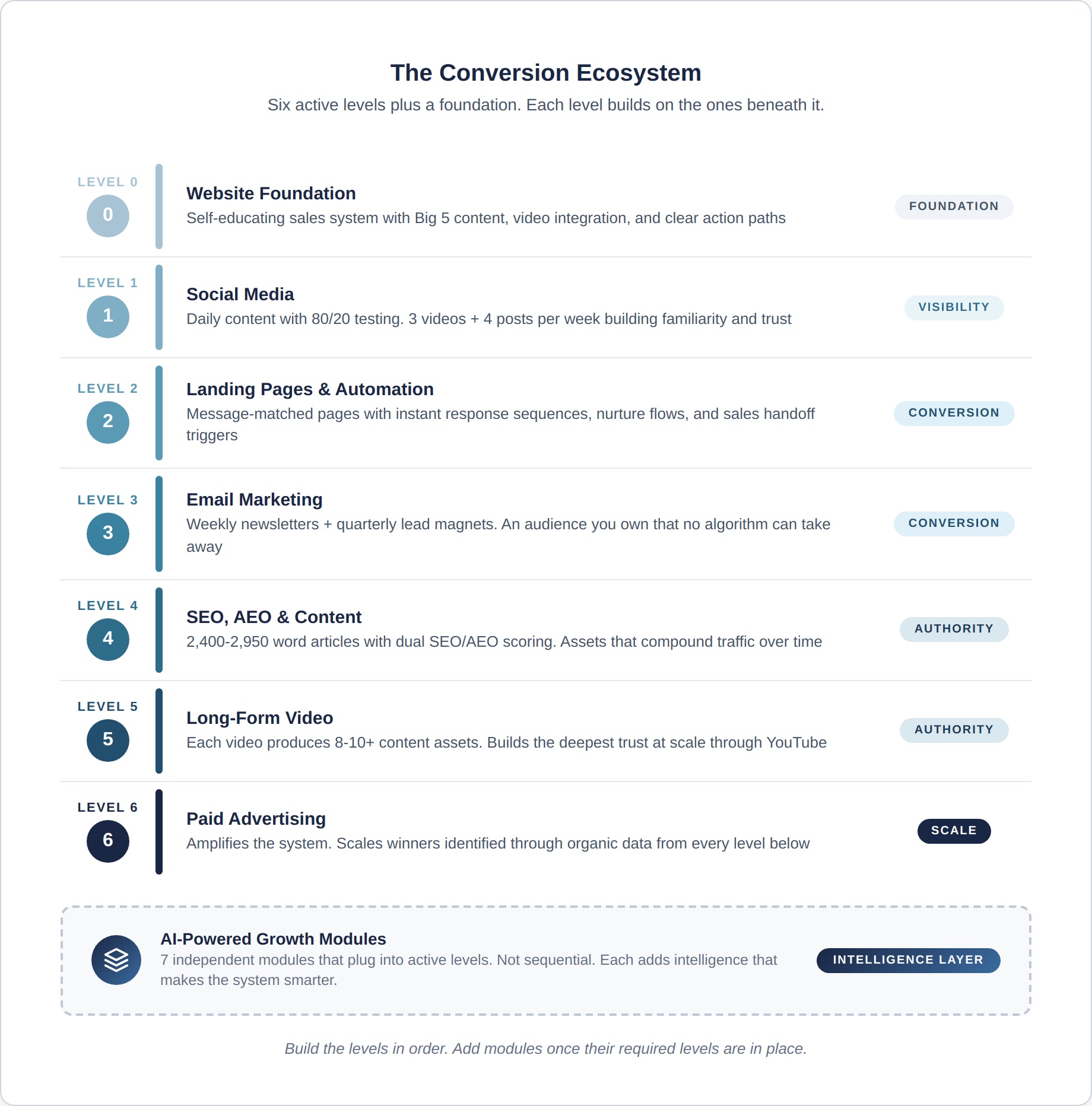 The Omnipresent Conversion Ecosystem has seven levels: One foundational level and six growth levels. Level 0 (website foundation), Level 1 (social media), Level 2 (landing pages and automation), Level 3 (email marketing with newsletters and lead magnets), Level 4 (SEO, AEO, and content), Level 5 (long-form video), and Level 6 (paid advertising). Each level builds on the previous ones. Beyond the levels, seven AI-Powered Growth Modules can be activated independently to add intelligence and automation to specific parts of the system.