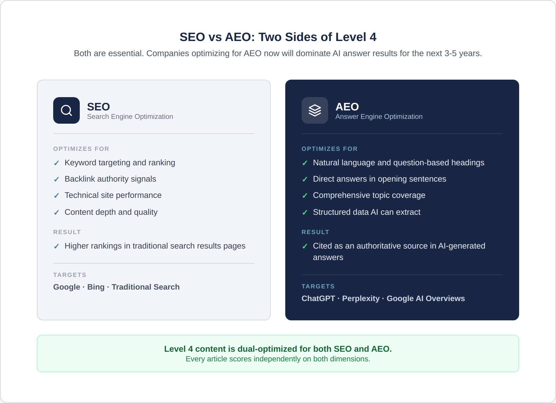 SEO optimizes content for traditional search engine rankings through keywords, backlinks, and technical factors. AEO, or answer engine optimization, optimizes content so AI platforms like ChatGPT, Perplexity, and Google’s AI Overviews can extract answers from it. Both are part of Level 4 and require a specific structure.