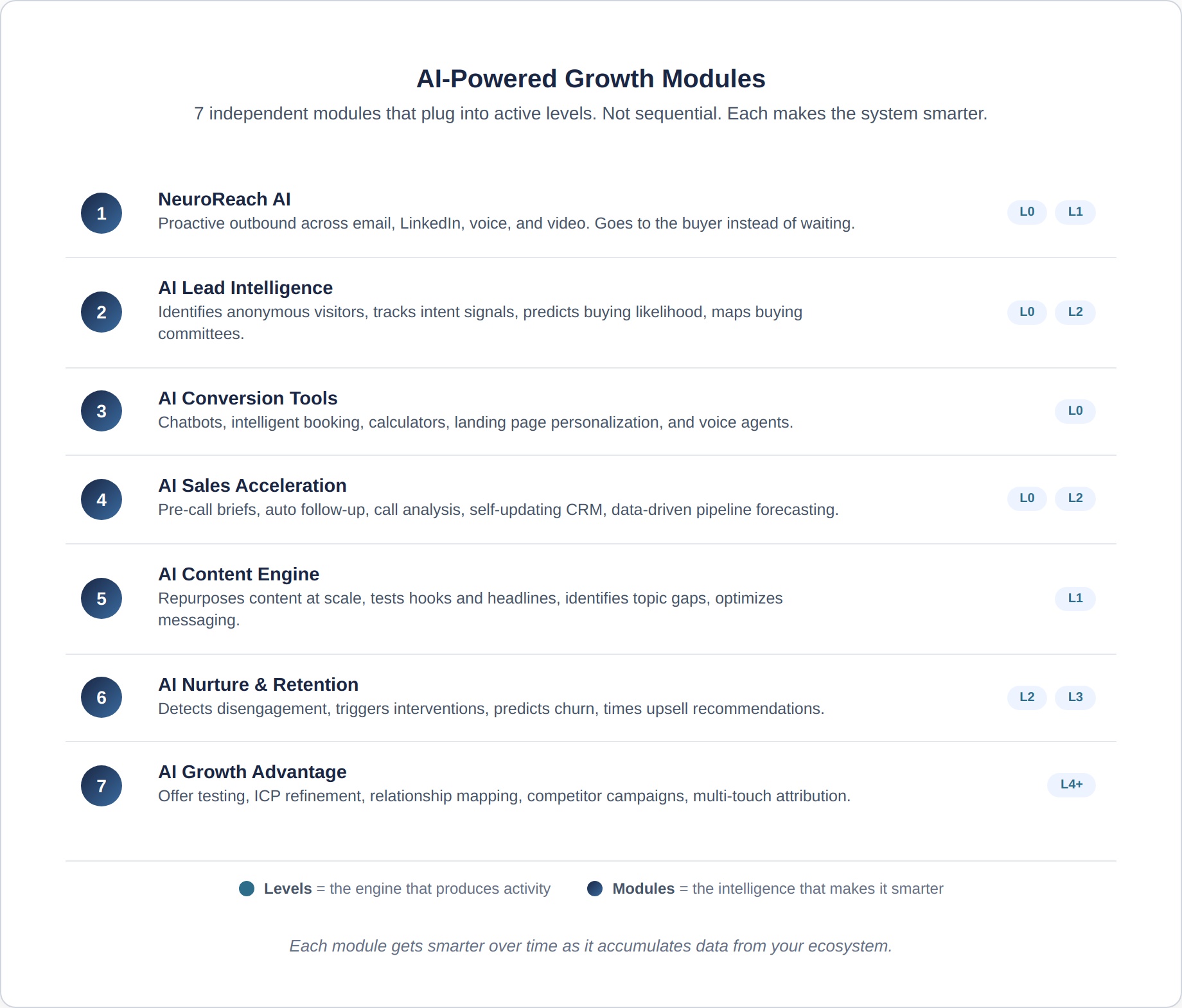 Levels are sequential: each one must be built before the next. They produce the marketing activity (content, emails, videos, ads). Modules are independent: each enhances specific levels without requiring any others. They add intelligence that makes the levels smarter (predicting which leads will buy, personalizing experiences, optimizing messaging, and identifying strategic advantages). Levels are the engine. Modules are the intelligence.