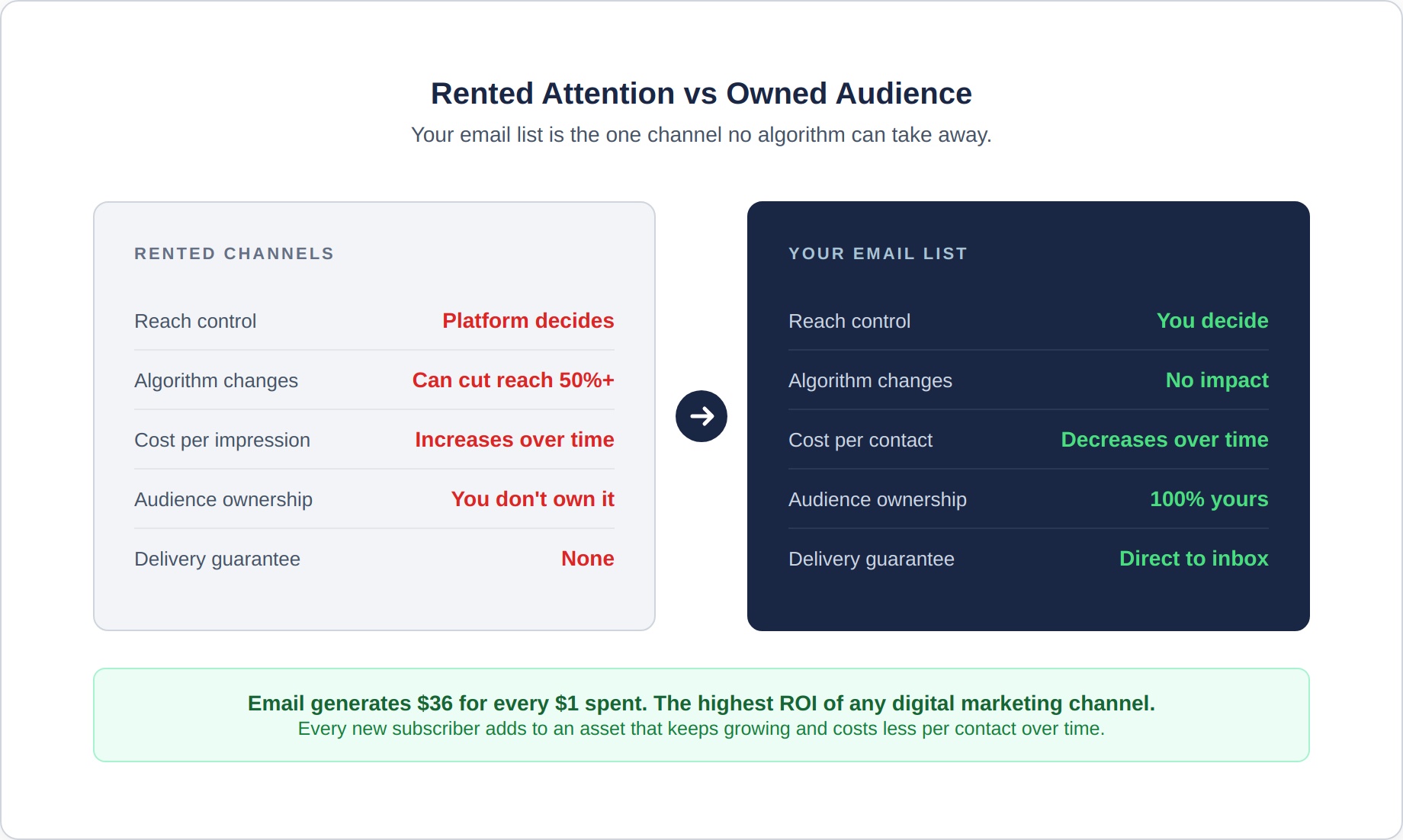 Social media reaches people on platforms you don’t control. Algorithms change. Reach declines. Accounts get restricted. One platform policy update can cut your visibility in half overnight, and there is nothing you can do about it.