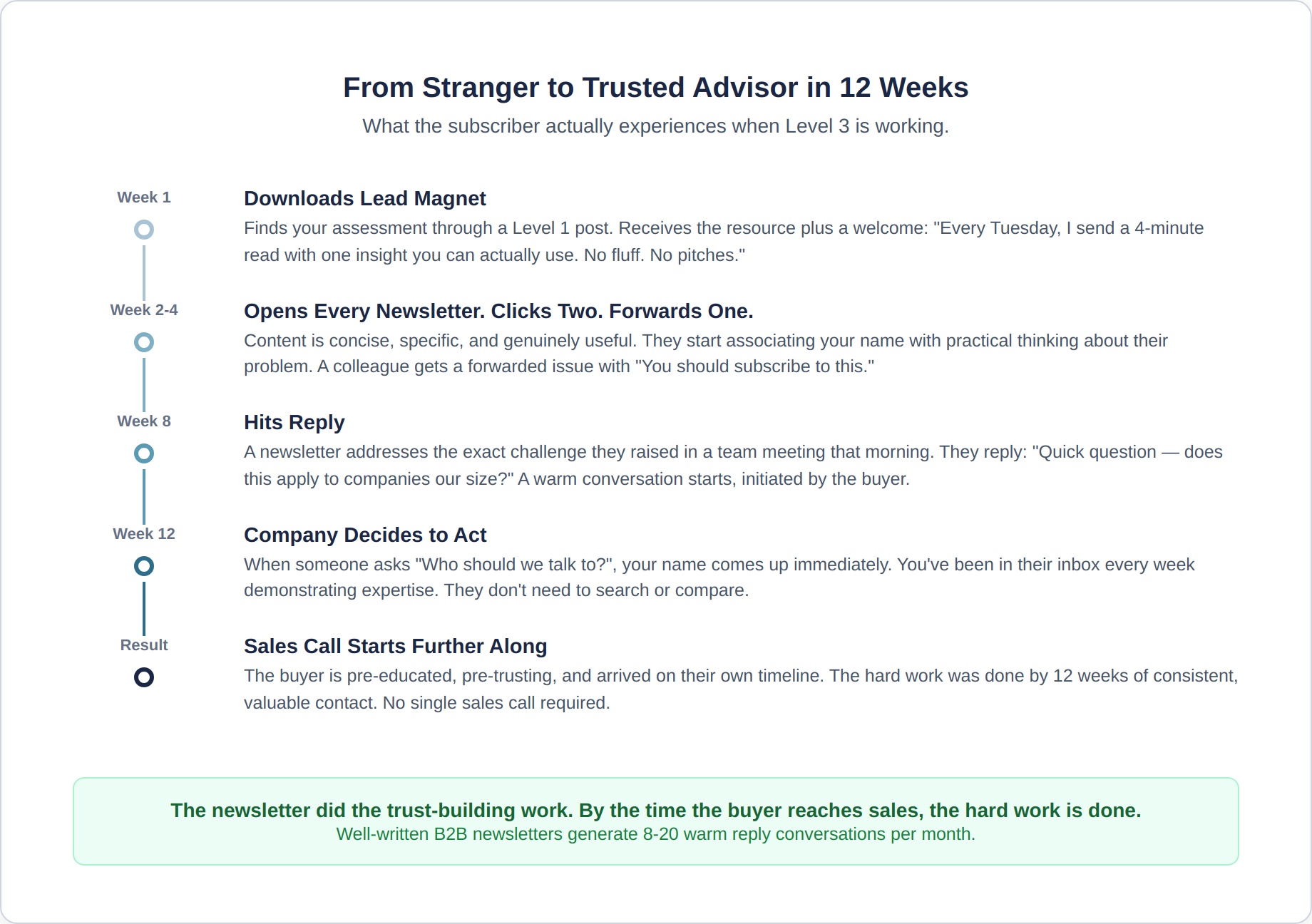 Month 6+: The email list is one of your strongest business assets. New subscribers join weekly. Engaged subscribers move toward sales conversations on their own timeline. The weekly newsletter produces a steady, predictable flow of warm contacts who are pre-educated and pre-trusting when they reach sales. Level 3 data is actively shaping content strategy across the entire Conversion Ecosystem.