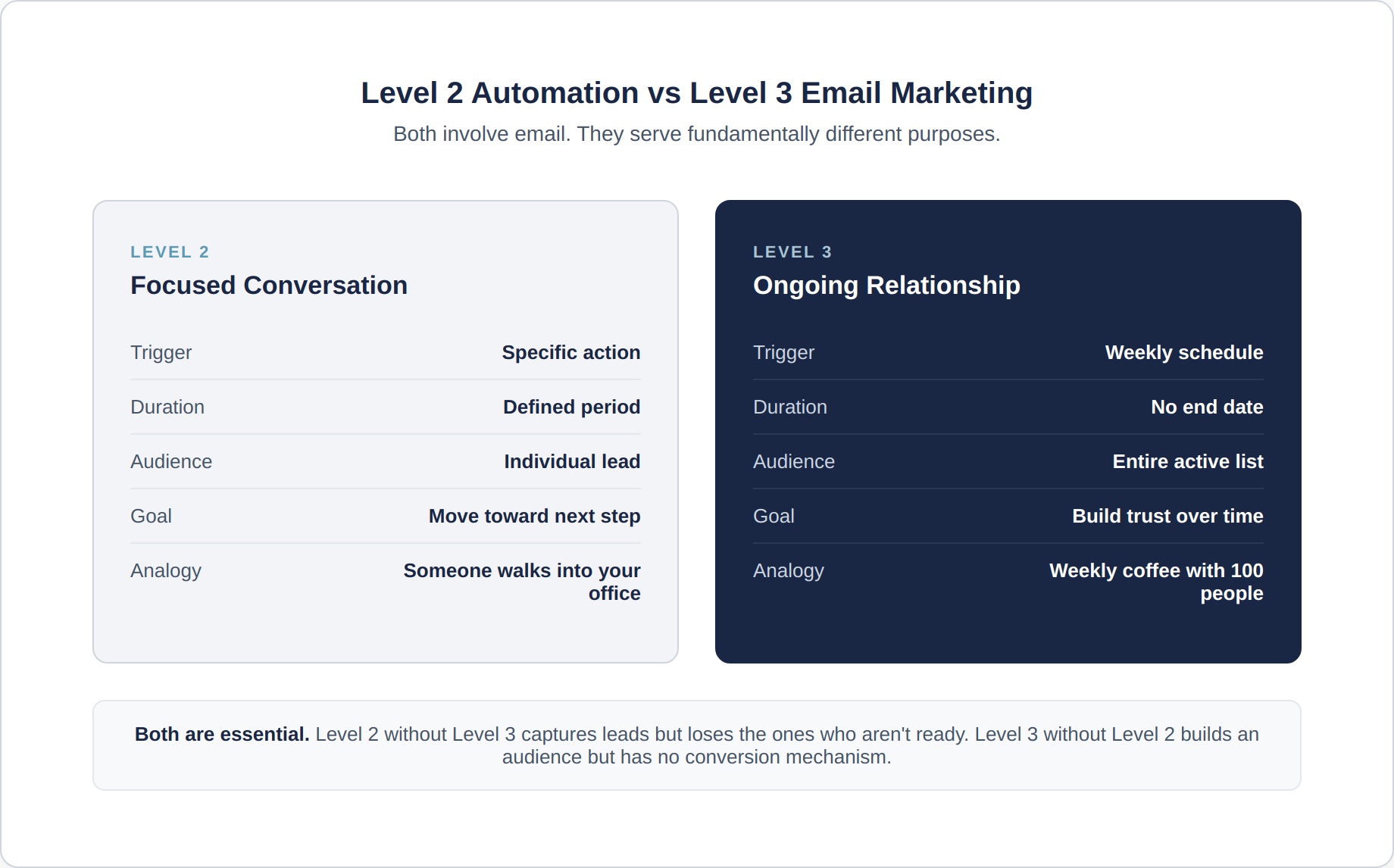 Level 2 sequences are triggered by specific actions, run for a defined period, and are designed to move a specific lead toward a specific next step. The newsletter is ongoing, sent to your entire active list weekly, and designed to build trust over time without a defined endpoint. Level 2 is the focused follow-up. Level 3 is the continuous relationship. Leads that complete Level 2 sequences without converting flow into the Level 3 newsletter, where the relationship continues.