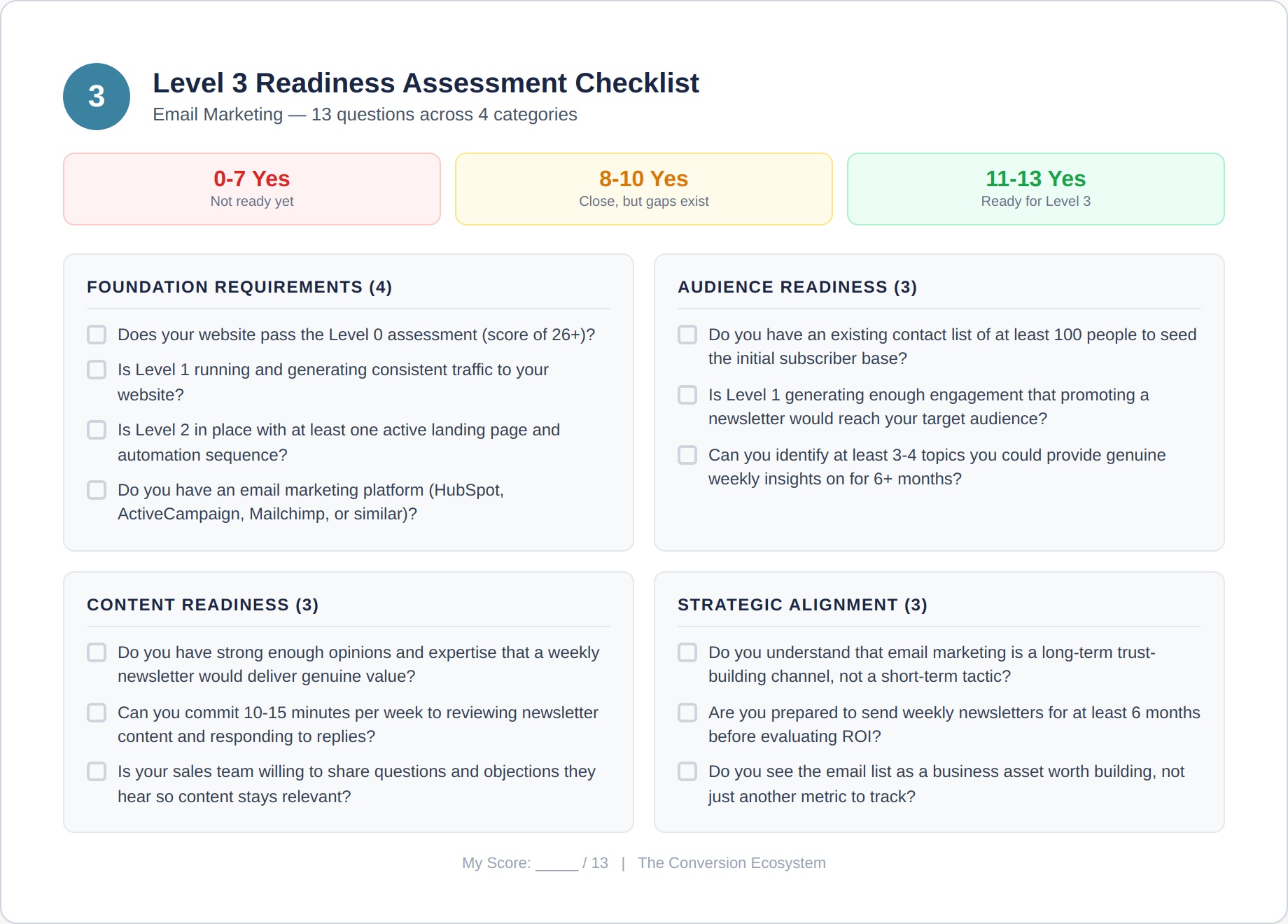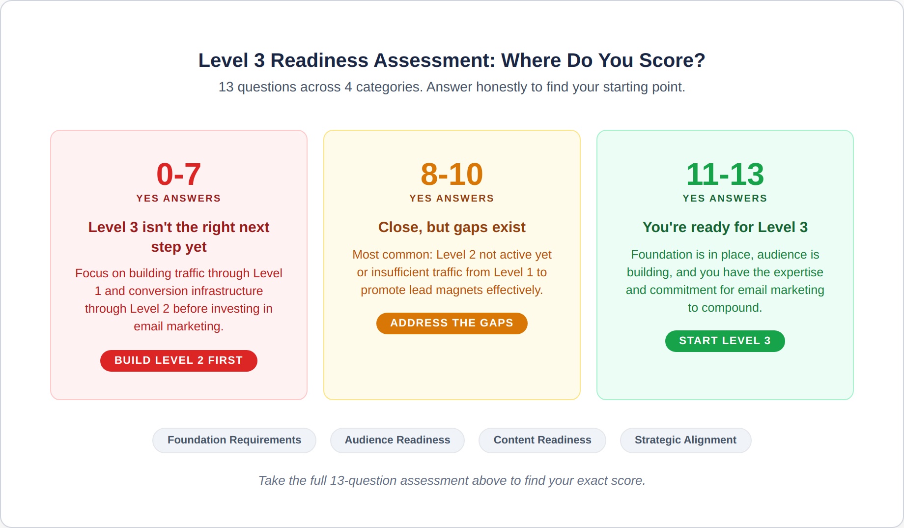 7 or fewer YES answers: Level 3 isn’t the right next step yet. Focus on building traffic through Level 1 and conversion infrastructure through Level 2 before investing in email marketing.