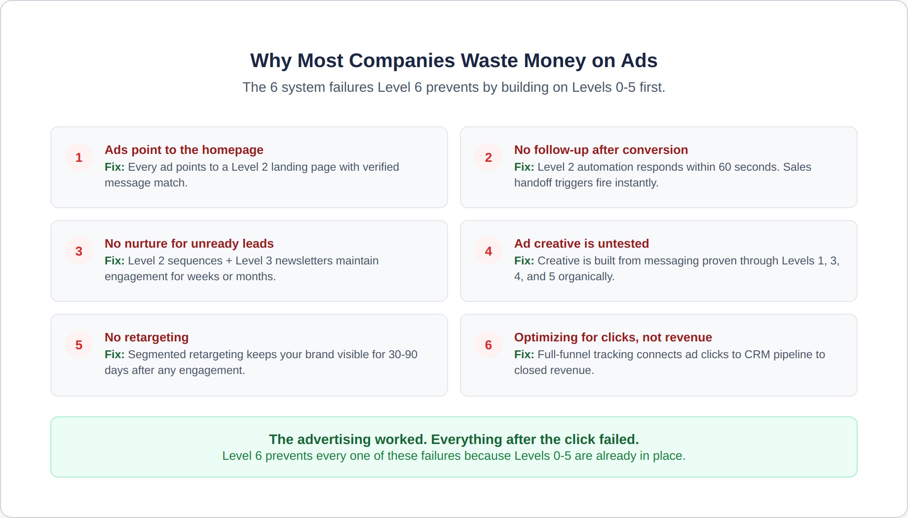 Level 6 comes last because it amplifies whatever system it points to. If the system converts, paid traffic produces profitable leads at scale. If the system is broken, paid traffic provides expensive proof of it faster.