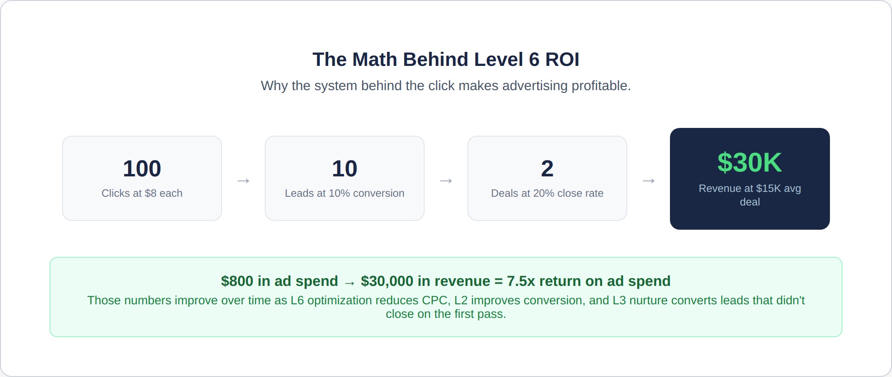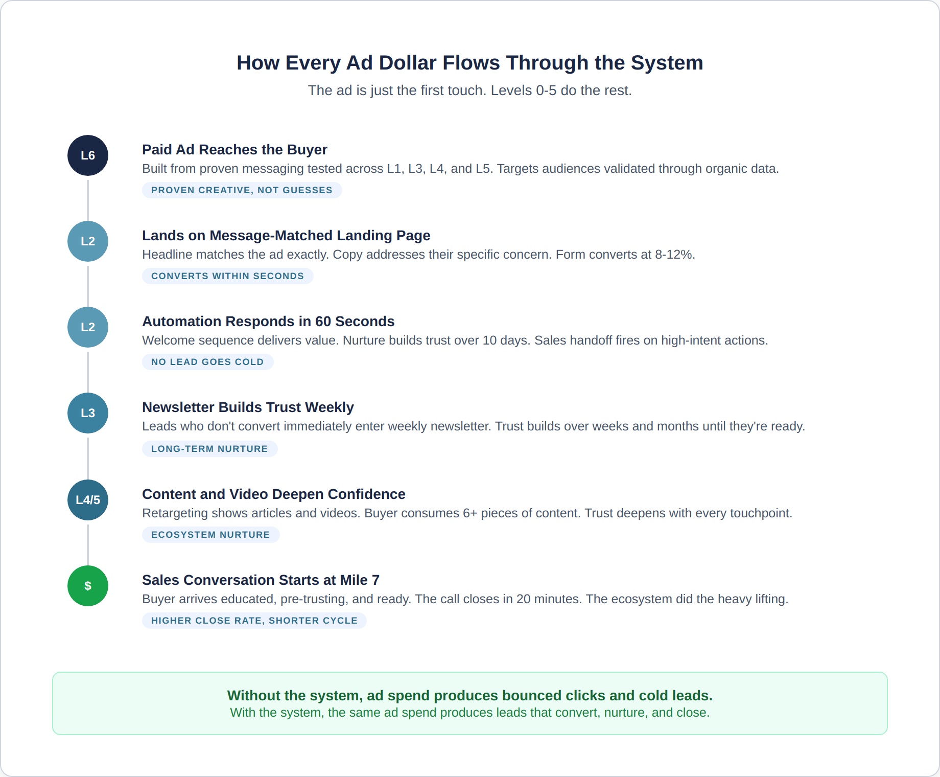 The reason Level 6 produces these returns, even as most companies report poor ad performance, is the system behind the click. The ad is just the introduction. Levels 0-5 do the rest.