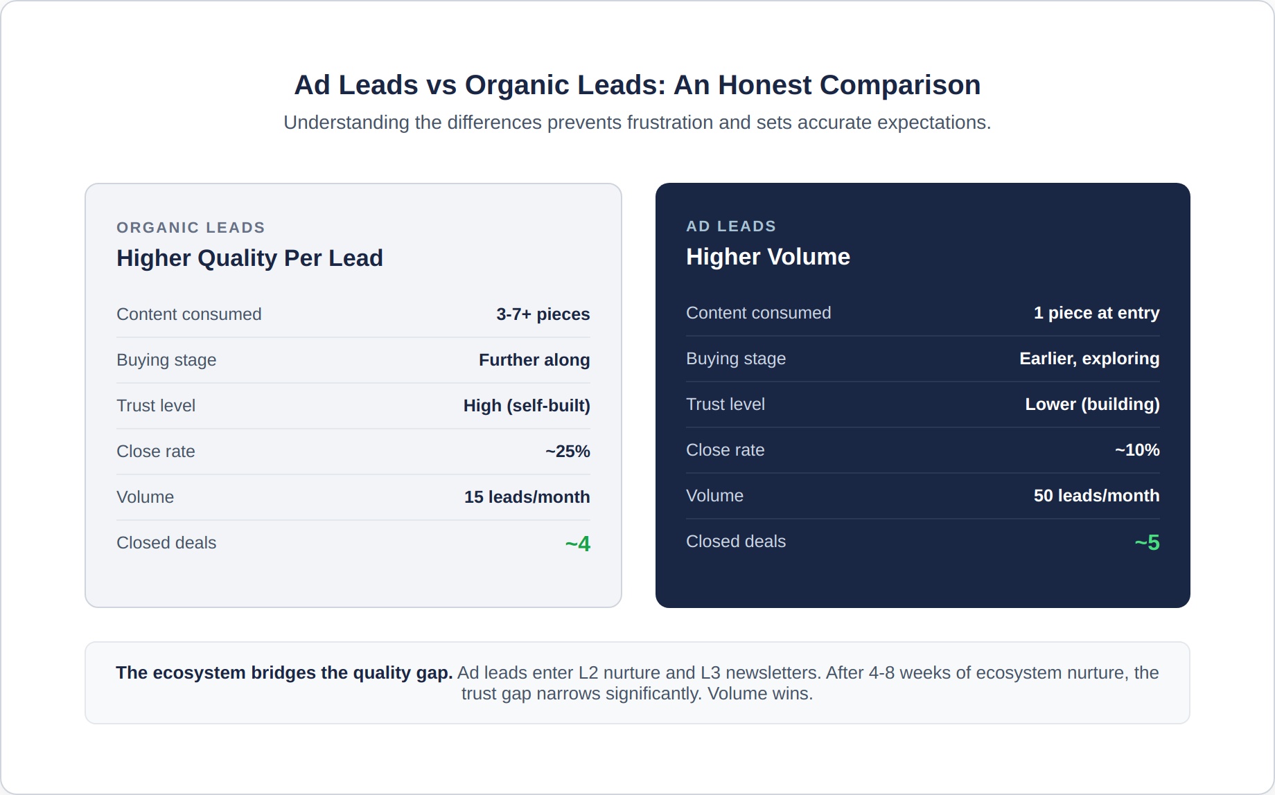 This is expected and normal. Ad leads haven’t consumed as much content before converting and may be earlier in the buying process. However, the ecosystem bridges this gap: Level 2 nurture sequences and Level 3 newsletters move ad leads through the same trust-building journey that organic leads travelled voluntarily. By the time ad leads reach sales after 4-8 weeks of ecosystem nurture, the quality gap has narrowed significantly. Additionally, the volume advantage of ad leads typically results in more total closed deals, even at lower per-lead conversion rates.