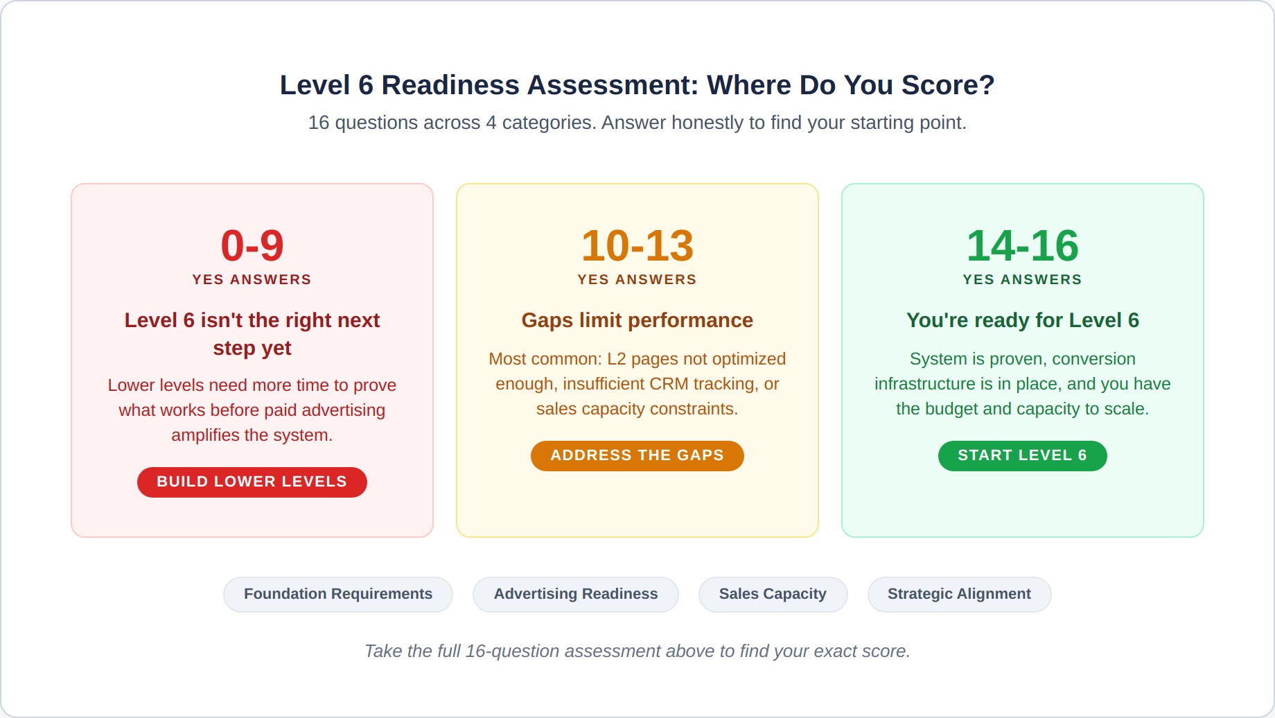 10-13 YES answers: Gaps exist that will limit Level 6 performance. The most common gaps are Level 2 landing pages that haven’t been optimized with enough organic traffic, insufficient CRM tracking to measure true ROI, or sales capacity constraints that limit lead handling. Address those before scaling with paid traffic.