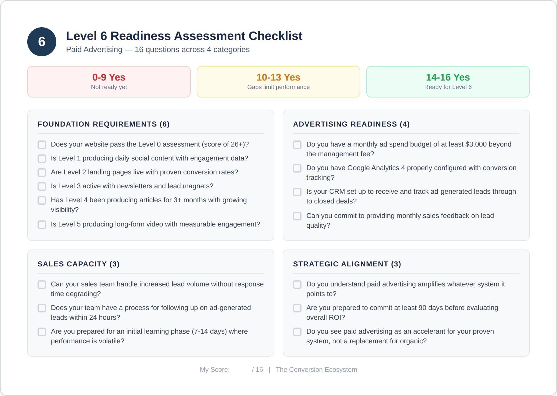 14-16 YES answers: You’re ready for Level 6. Your system is proven, your conversion infrastructure is in place, and you have the budget and capacity to scale through paid advertising.